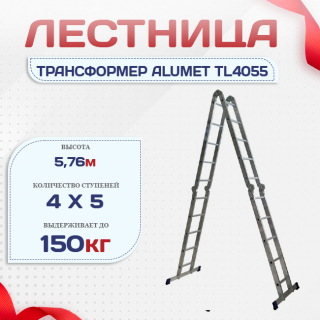 Лестница с трансформирующейся конструкцией состоит из 4-х секций и способна принимать различные положения. Ее можно разложить в стремянку-помост или использовать как обычную лестницу. В любом положении конструкция обеспечивает устойчивость даже на неровных поверхностях. Универсальная лестница, легкая и компактная в собранном виде. Благодаря профилированному алюминию и усиленным поперечинам выдерживает до 100 кг. Устойчива к появлению коррозии.